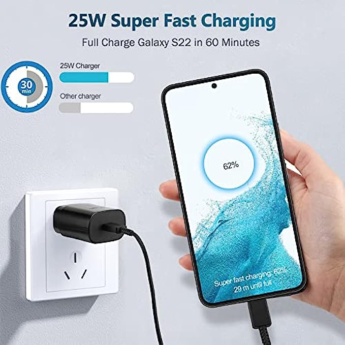 • 【Super Fast Charger】The 25W Type C charger cable kit supports multiple fast charging techonology, Samsung super fast charging, PD 3.0, PPS, and QC 4.0. It provide fast charging up to 25W output, super fast charging for Samsung Galaxy S21, S21 Ultra, S21 Plus, S22, S22+, S22 Ultra, Note 10, Note 20, S20 from 0% to 50% in just 30 min,full charge Galaxy S21 in 1h, full charge Galaxy S22 in 50 min.