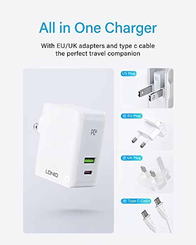 • 【What you get】1 x LDNIO 32W wall charger, 1 x UK Plug, 1 x EU Plug, 1 x 3.2FT USB C to C Cable, LDNIO 1-YEAR warranty. If you have any questions about our charger, please feel free to contact us.