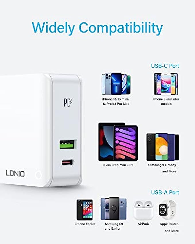 • 【Widely Comparability】This fast charging block is compatible with iPhone 13 Pro Max/13 Pro/12 Pro Max/12 Pro, iPad Air/iPad Pro, Macbook, AirPods and other smartphones, tablets, accessories. (Please Notice the USB-A Port is not a Fast Charging Port(12W Max), you can use this port charging for your old model phone and other accessories like Apple Watch or AirPods).
