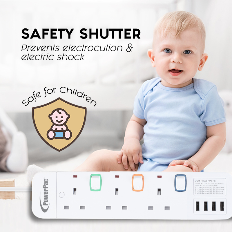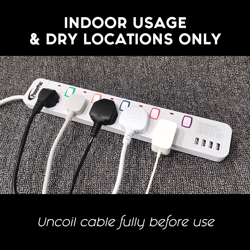 PowerPac Power Extension Socket Extension Cord 3/4/5/6 way 3 meter with 4x USB Charger (PP9113U to PP9116U)