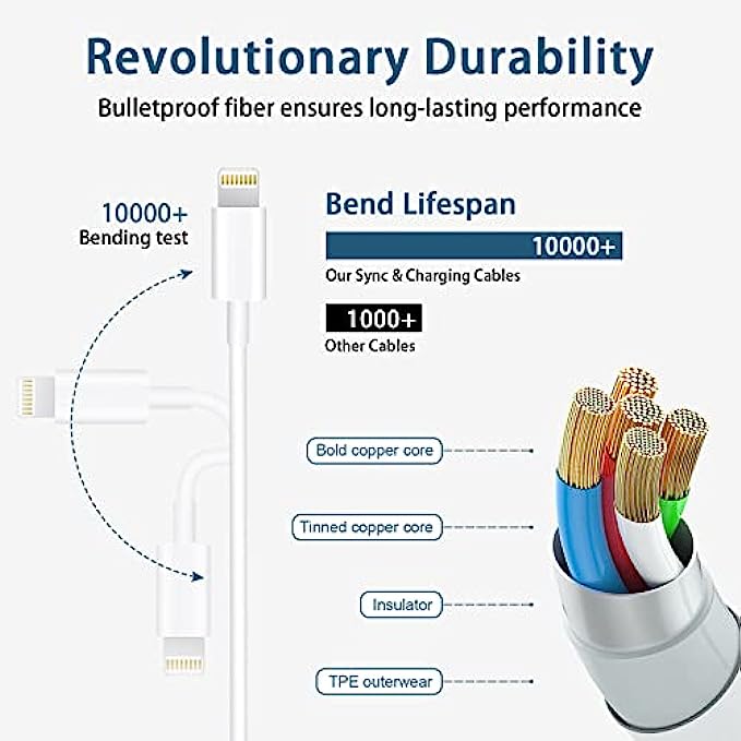 【Safety Efficient Fast Charging】 These apple chargers for iPhone owns bulit-in multi-protection system, avoiding from over-voltage, over-charge, over-heat, etc. The smart chip including in the MFi certified lightning cable matches the current required by the Apple device automatically, charges your iPhone/iPad device fast, safely and steadily. Tangle-free 6 Feet length is convenient for usage while charging and sync at home/office/travel in bed, hotel rooms, and more.