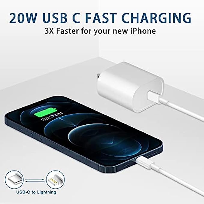 【Ultra-Fast Charging】 20W USB C fast charger with 6ft type c to lightning cord, charges iPhone 12 up to 50% in just 30 minutes, which saves more than 1 hour for you, when compared to the 5W original charger.